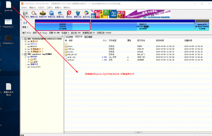 再把已经编辑好的 grub.cfg 文件拖动到 DiskGenius 刚刚的位置, 并且替换之前的文件.